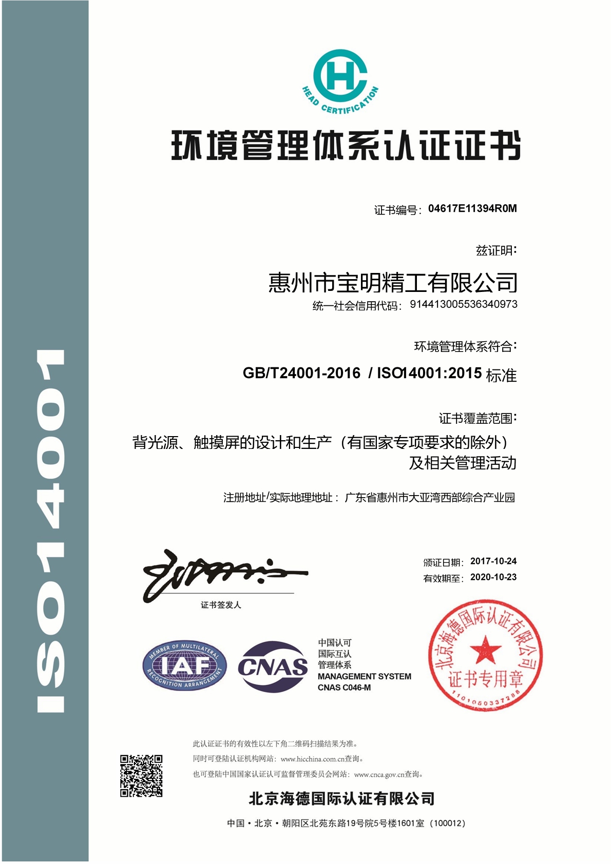 環(huán)境管理體系認(rèn)證證書